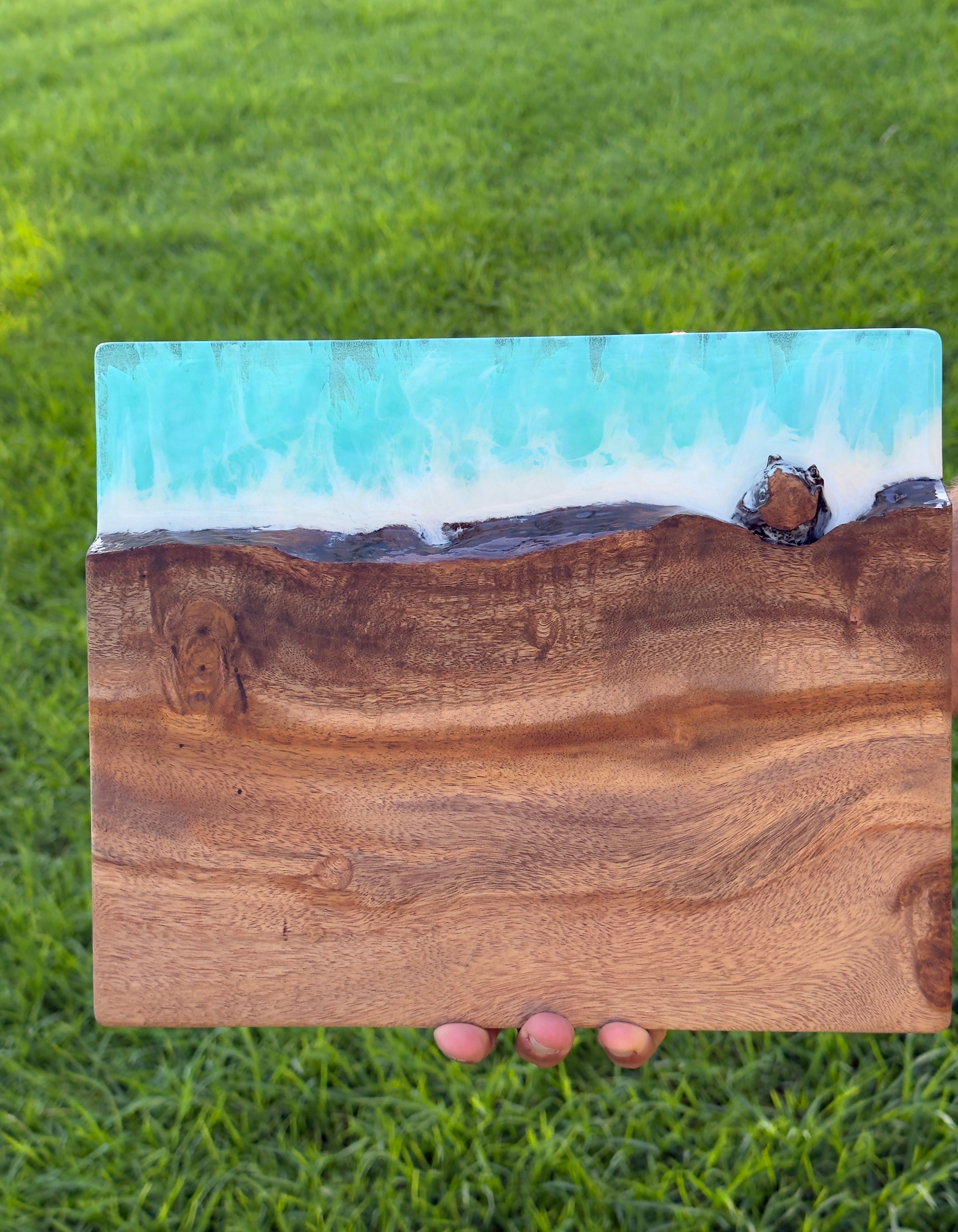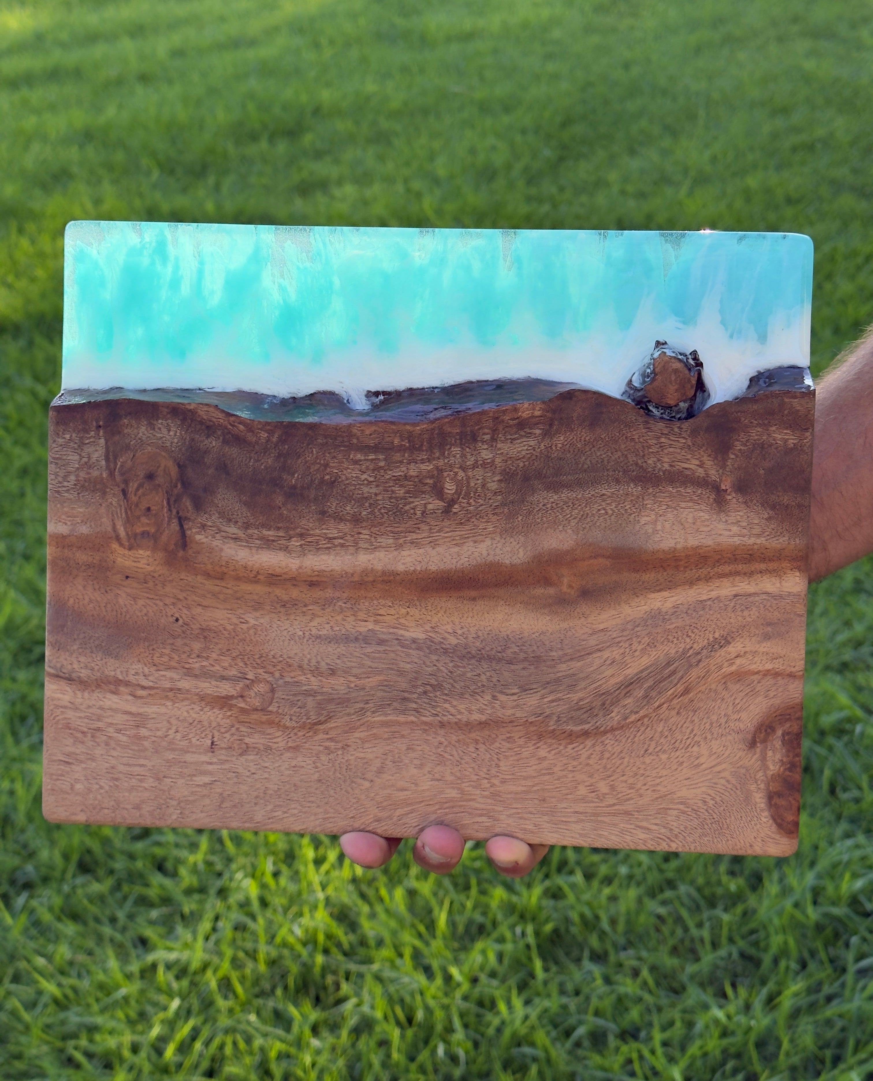 Made from Opiuma wood sourced right here on Oahu. The artist shapes each board using the natural edge of the wood to mirror Hawaii's coastline, so every single one looks different. No stains, no dyes. Just the natural color of the wood.